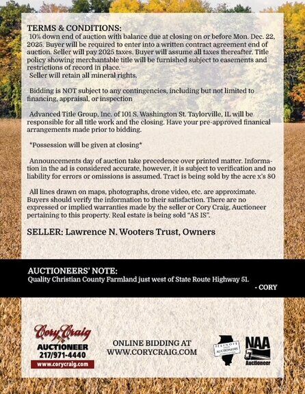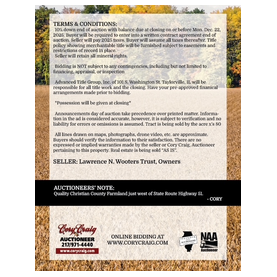 10% down end of auction with balance due at closing on or before Mon. Dec. 22, 2025. Buyer will be required to enter into a written contract agreement end of auction. Seller will pay 2025 taxes. Buyer will assume all taxes thereafter. Title policy showing merchantable title will be furnished subject to easements and restrictions of record in place.